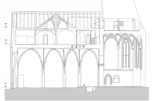 Leistungsphase 1 – 5 HOAI, komplette Bestandsvermessung mit 3D-Laserscan (extern), Tragwerksstudie (externer Tragswerksplaner), Brandschutz, Historische Bauforschung, Archivalien.